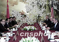 APEC快递:江泽民主席与布什总统举行会谈 2001年10月19日 13:58 ![]() 10月19日,国家主席江泽民在上海西郊宾馆会见美国总统布什。中新社图 ![]() 10月19日,中国国家主席江泽民在上海与美国总统布什举行会谈。中新社图