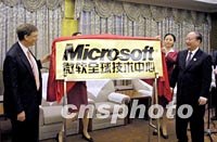 ![]() 十月十八日上海市市长徐匡迪与微软公司主席比尔·盖茨为新成立的微软全球技术中心揭牌。同时,上海市政府与微软公司还举行“共同促进上海软件产业发展谅解备忘录”签字仪式。中新社记者 潘索菲 摄
