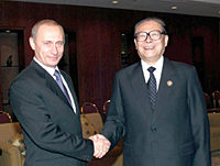 江泽民会普京 双方就反对恐怖等取得广泛一致 2001年10月20日 11:05 ![]() 10月20日,中国国家主席江泽民在上海会见前来参加2001年亚太经合组织领导人非正式会议的俄罗斯总统普京。