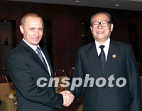 10月20日,中国国家主席江泽民在上海会见前来参加2001年亚太经合组织领导人非正式会议的俄罗斯总统普京。中新社图
