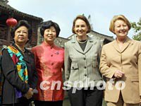 组图:APEC首脑配偶畅游“中国第一水乡” 2001年10月21日 14:37 ![]() 香港特别行政区长官董建华的夫人赵洪娉十月二十一日与参加上海APEC领导人峰会的首脑夫人一起在水乡周庄游船,图为她向岸边的市民招手。中新社记者 潘索菲 摄 ![]() APEC首脑夫人21日畅游“中国第一水乡”。香港特首夫人赵洪娉(左)、加拿大克雷蒂安总理夫人艾琳·克雷蒂安(右二)、澳大利亚霍华德总理夫人珍妮特·霍华德(右)与陪同游玩的江苏省副省长张连珍在周庄一起合影。中新社记者 潘索菲 摄