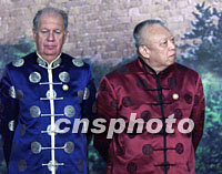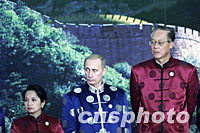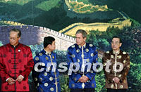 ![]() 美国总统布什身穿唐装二十一日站在上海科技馆中国万里长城图案背景前,聆听中国国家主席江泽民宣读APEC《领导人宣言》。亚太经合组织第九次领导人非正式会议二十一日在上海圆满闭幕。中新社记者 王瑶 摄 ![]() 新加坡总理吴作栋、泰国总理他信、美国总统布什和越南总理潘文凯身穿唐装21日站在上海科技馆中国万里长城图案背景前,聆听中国国家主席江泽民宣读APEC《领导人宣言》。亚太经合组织第九次领导人非正式会议21日在上海圆满闭幕。中新社记者 王瑶 摄
