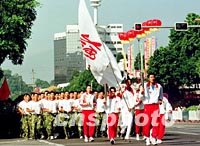 日前,福建省的运动员代表及各界组成的长跑方阵浩荡通过福州古田路五一路交叉路口。中新社图 郑祚声 摄