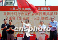 香港28日举行九运会授旗典礼,政务司司长曾荫向代表团筹委会主席霍震霆授旗,祝愿香港选手创造好成绩。中新社图 卢峰 摄
