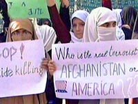 组图:美、英对阿富汗军事打击进入第四周 2001年11月01日 09:44 ![]() 阿富汗坎大哈民众在美军空袭之际整理破损的家园。美军三十一日首次出动B-52轰炸机,使四周来遭轰炸的坎大哈满目疮痍,几乎没有一座完整的房屋。 ![]() 二百多名巴基斯坦妇女儿童三十一日走上街头,反对美国对阿富汗进行军事打击。美国对阿富汗的军事打击日前进入第四周。