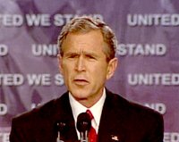 布什发表演讲 呼吁美国民众恢复正常生活 2001年11月09日 18:31 ![]() 布什8日在亚特兰大发表全国讲话说,一个四岁的小女孩曾写信问他:"那些人都不知道我们是谁就攻击我们。我们干嘛不告诉他们我们叫什么呢?"布什接着说:"我们会告诉那些恐怖分子我们是谁的,我们会告诉他们美国是谁。"布什的讲话引来在场五千名听众起立鼓掌。