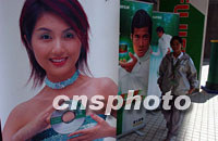 在九运会主会场的奥林匹克中心,香港歌星杨千〔女+华〕、郭富城的巨幅广告成为商家的装饰门面。中新社记者 任海霞 摄