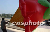 十一月九日,广州奥林匹克中心的一名工人正顶着大风布置广州市花--木棉花的装饰充气花朵。中新社记者 任海霞 摄