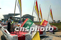 十一月九日,一名工人正在维护九运会开幕式上运动员入场时使用的帆船。中新社记者 任海霞 摄