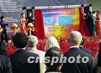 《中华人民共和国第九届运动会》邮票首发式十日在广州举行,国家邮政局局长刘立清为邮票图案揭幕。中新社图 罗仰明 摄