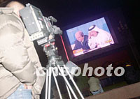 午夜时分,北京火车站站前广场电视大屏幕前,媒体记者和市民一起等候中国入世新闻。中新社图 张勤 摄