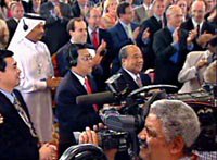 卡塔尔特写:中国入世,一次空前的"盛宴"(附图) 2001年11月11日 18:46 ![]() 第四届WTO部长会议十日晚在卡塔尔首都多哈举行会议正式通过中国入世。图为会议主席台。中新社记者 钱兴强 摄 ![]() 卡塔尔财政、经济和贸易大臣Youssef Hussain Kamal先生在多哈一槌落下宣布通过中国加入WTO时,多哈WTO第四次部长级会议的全体代表鼓掌向中国代表团表示祝贺。