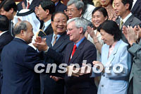 ![]() 中国加入WTO议定书签字仪式于北京时间12日凌晨在多哈举行,石广生部长签字后同各国代表一起举杯庆祝中国成为WTO大家庭中的一员。中新社记者 钱兴强 摄 ![]() 中国加入WTO议定书签字仪式于北京时间12日凌晨在多哈举行,石广生部长签字后与代表握手致意。中新社记者 钱兴强 摄