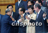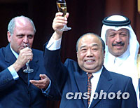![]() 中国加入WTO议定书签字仪式于当地时间11日晚在多哈举行,石广生部长签字后与在场人士举杯互致祝贺。中新社记者 钱兴强 摄 |