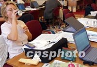 图:各国记者关注中国入世签字仪式 2001年11月12日 11:18 ![]() 第四届WTO部长会议十一晚举行中国入世签字仪式和通过台湾加入世贸组织时,各国记者在新闻中心紧张工作。图为一名女记者边用餐边写稿。中新社记者 钱兴强 摄 |