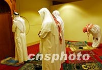 在卡塔尔首都多哈举行的第四届WTO部长级会议上,来自阿拉伯国家的穆斯林教徒每天虔诚进行祈祷。中新社记者 钱兴强 摄