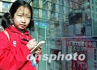 北京九岁学童轩轲,十一日在报栏前记下中国入世的新闻,她将把它作为素材写进日记。中新社图 刘殊瑾 摄