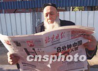 一位新疆维吾尔族七旬老翁12日在北京街头,仔细地阅读报道中国入世新闻的报纸。中新社记者 张勤 摄