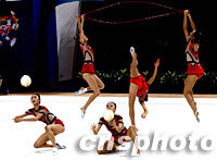 广东艺术体操队美少女组合十二日在中国第九届全运会的三绳二球预赛中脱颖而出,得分最高。中新社图 洪少葵 摄