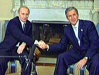 布什与普京举行会晤 未能就反导条约达成协议 2001年11月14日 07:43 ![]() 俄美两国首脑13日在美国开始为期3天的会谈,就反导条约进行磋商。这是普京出任总统后首次访美,也是他和布什自今年6月以来的第4次会晤。中新社