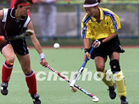 在中国第九届全运会十四日进行的女子曲棍球比赛中,广西队(黄衣)以三比一战胜劲旅甘肃队。中新社记者 毛建军 摄