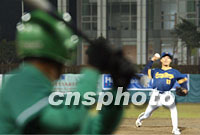 九运会棒球决赛十四日在广州奥林匹克体育中心棒球场举行,东道主广东队迎战天津队。广东队投球手赖国均在大力投球。中新社记者 张宇 摄