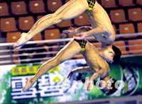 一对跳水选手从比赛场馆内悬挂的巨幅广告前跃过,跳水皇后伏明霞就是该产品的形象代言人,近年来体育与商业的关系更加紧密。中新社记者 郑萍萍 摄
