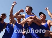 福建赛艇队十六日夺得九运会男子八人单桨有舵手金牌后,激动得把舵手举起欢庆胜利。中新社图 张宇 摄