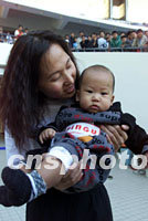 奥运冠军王军霞怀抱五个半月的儿子十七日出现在九运会田径赛场,为在首日赛事中亮相的马家军队员助威。中新社记者 毛建军 摄