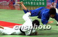 广东选手冼冬妹〖白〗18日在九运会女子柔道决赛上,战胜对手获该项比赛金牌。图为冼冬妹将对手抛出场外。中新社图 洪少葵 摄