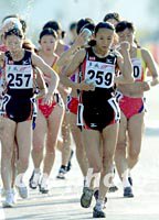 组图:王妍打破女子20公里亚洲竞走纪录 2001年11月19日 11:14 ![]() 辽宁竞走选手王妍(259号)十九日在中国第九届全运会女子二十公里竞走比赛中,以一小时二十六分二十二秒的成绩打破亚洲纪录并获得冠军。中新社记者 毛建军 摄 ![]() 十九日,辽宁选手王妍在九运会田径二十公里女子竞走决赛中,以一小时二十六分二二的惊人成绩打破亚洲纪录,夺得该项目金牌。中新社记者 陈文 摄