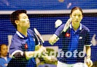香港羽毛球队选手廖国华、李咏梅,19日在九运会羽毛球混合双打第一轮比赛上,以0比2负广西队。中新社记者 洪少葵 摄