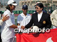 九运传真:香港男子网球双打夺铜牌(附图) 2001年11月19日 20:26 ![]() 香港网球选手许建业(右二)唐敏聪(左二)十九日夺得九运会男子网球双打第三名后,与教练等在特区区旗前合影,留下难忘的一刻。中新社记者 任海霞 摄 ![]() 香港网球选手许建业(左)与唐敏聪十九日在九运会男子双打比赛中,战胜实力雄厚的湖北选手朱本强、姜山,为香港代表团再添一枚奖牌。中新社记者 任海霞 摄