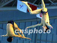 在九运会男子双人跳水比赛中,一对选手起跳时出现意外。双人比赛比单人比赛有着更多的不稳定因素。中新社记者 郑萍萍 摄