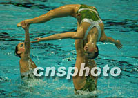 二十一日,九运会花样游泳比赛预赛全面开战,图为江苏队在集体自由自选预赛中表演“出水芙蓉”。中新社记者 张宇 摄