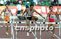 上海选手谈春华(中)在二十二日举行的第九届全运会男子四百米跨栏比赛中,以四十九秒八五的成绩获得冠军。中新社记者 毛建军 摄