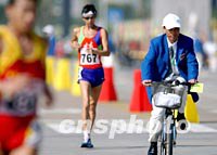 在九运会田径男子五十公里竞走比赛中,裁判员骑自行车在赛场上执法。中新社图 陈文 摄