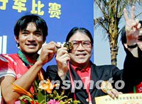 快讯:香港自行车运动员黄金宝成功卫冕(附图) 2001年11月23日 14:53 ![]() 香港单车运动员黄金宝23日在九运会自行车个人公路赛180公里赛事上,夺得冠军。香港体育代表团团长霍震霆欣喜的祝贺他为香港队拿下第二枚金牌。中新社传真 卢峰 摄 ![]() 香港单车运动员黄金宝23日在九运会自行车个人公路赛180公里赛事上,夺得冠军。中新社传真 卢峰 摄