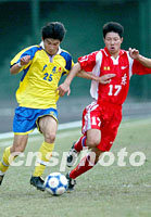 十一月二十三日下午,九运会男足赛山东队(红衣)二比一胜广东队,夺得九运会男足决赛的第三名。中新社图 陈文 摄