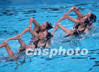 四川美少女们在广州九运会花样游泳集体决赛中,从碧波中涌起玉臂连环,赏心悦目。 中新社记者 贾国荣 摄