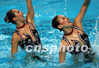 北京“美女”张晓欢、夏晔二十四日在广州举行的九运会花样游泳女子双人自由自选比赛中,以优美的动作夺得亚军。中新社记者 贾国荣 摄
