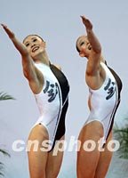 江苏花样游泳的美女双秀在广州九运会夺冠后亮相,展现武侠剑客般的运动之美,令全场倾倒。中新社记者 贾国荣 摄