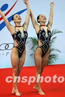 北京双人花样游泳的“鱼美人姑娘”,在广州九运会决赛后展示水上运动的娇人身材。中新社记者 贾国荣 摄