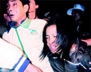 图文:台湾民进党造势会发生内讧 数百人互殴 2001年11月27日 09:04 ![]() 黄正男女儿黄露慧被打伤,其后男子眼角出血。(台湾联合报图) 中新网香港11月27日消息:台北讯,台湾民进党昨晚在嘉义举行的一场选前造势会,发生民进党严重内讧事件,数百人先后两度发生冲突,互相殴打造成多人受伤。 由于民进党“立委”候选人蔡同荣在昨天的晚会上邀请陈水扁站台造势,同党籍嘉义“市长”候选人黄正男的支持者认为未获通知,有不被尊重的感觉,遂在造势场合上,一路追打蔡同荣。蔡同荣的小腿因此受轻伤。 这场冲突前后发生两次,第一次在晚间8时陈水扁进场时,黄正男的支持者为了一问究竟,当场追打蔡同荣。第二次在陈水扁离去时,场内再次打起来。 在喊打声中,一阵拳打脚踢,黄正男的女儿黄露慧也被打伤。 现场消息指,参与互殴者达三四百人之众。 陈水扁致辞时,黄正男的支持者在台下特别以汽笛制造声响抗议,陈水扁在台上强调这场造势晚会是为蔡同荣造势,请大家保持“理性及风度”。 陈水扁在台上说话间,黄正男不顾安全人员引导,强行走上演讲台左边,遭安全人员挡在讲台楼梯旁。陈水扁在台上大声疾呼,黄正男表情颇为无奈,只好自行走下讲台并绕到讲台前面,但终被安全人员引导离开。 陈水扁在晚上8时45分结束演讲,由安全人员护卫搭车离开,部分在场民众见状,又朝车队方向追逐,这时有人阻挡、有人吶喊,场面相当混乱。 据指出,这场冲突的由来并不突然,嘉义“市长”选举几场造势场合所引发的惊爆点,黄正男拥有民进党提名的身分,但在几次造势场合中,泛绿阵营支持无党籍“市长”候选人陈丽贞的传言甚嚣尘上,黄正男则被指为陈水扁“弃保”的对象,终于引发黄正男的支持者不满。 尤其在24日晚,陈水扁的老师、台大教授李鸿禧在嘉义为陈丽贞站台。当时李鸿禧强调,民进党推出的“市长”候选人根本“毫无胜算”,他自称身为阿扁的老师,当然知道陈水扁支持的是陈丽贞。 |