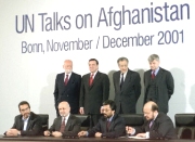 图文:波恩会谈结束 阿富汗四方签署分权协议 2001年12月05日 19:45 ![]() 四方代表签署协议 中新网北京12月5日消息:阿富汗4方代表于当地时间5日上10时10分,在波恩附近的彼得斯贝格宾馆签署了关于成立阿富汗临时政府的协议,波恩会谈在近9天马拉松式的谈判后终于落下帷幕。 根据协议,阿富汗南部普什图族领导人萨耶德·哈米德·考尔绍伊将出任临时行政当局主席一职,北方联盟则占据了临时行政当局中负责内政、外交和国防等事务的关键职位。临时政府由29名成员组成,本月22日起运作,任期6个月。 考尔绍伊曾在20世纪90年代出任过阿富汗副外长,他目前正在阿富汗坎大哈市附近指挥部队与塔利班士兵作战。 德国总理施罗德说,协议的达成显示国际社会有勇气和能力解决所面临的复杂问题,他希望会谈各方能够切实履行所达成的协议。他说,协议为阿富汗重建创造了必要的前提,德国将和其他欧盟国家一道,为阿富汗战后重建提供“实质性”的帮助。 在多方压力下,参加阿富汗问题会谈的各方代表经过4日晚通宵达旦的艰苦谈判,终于在5日清晨就组成临时政府的人选问题取得一致,从而为协议的最终签署铺平了道路。 |