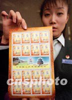 国家邮政局将于十一日发行中国入世纪念邮票一枚,面值0.8元人民币。中新社记者 史利 摄