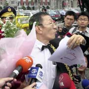 图文:一讨债公司老板向吕秀莲求婚遭警方拦下 2001年12月11日 13:51 ![]() 吕秀莲(资料图片) ![]() 董念台11日捧着99朵红玫瑰,率领48辆豪华礼车,浩浩荡荡去向心仪许久的吕秀莲求婚,但遭警方拦下。董念台说不能阻止他求婚的意志。(张良一摄) 中新网香港12月11日消息:台北讯,台湾一讨债公司负责人董念台今天上午演出向吕秀莲“求婚记”,不过求婚车队在途中即遭到台北市警察局拦下,董念台在不满下愤而离去。 据“中央社”报道,对于今天的求婚之举,董念台称,他欣赏吕秀莲憨直、有话直说的个性,他认为吕是位优秀的女性。 上午九时许,由十二辆奔驰、十二辆卡迪拉克高级轿车组成的车队从台北市中正纪念堂出发,浩浩荡荡准备到“总统府”“求婚”。 车队在抵达“总统府”前的贵阳路遭辖区员警拦下,董念台穿着燕尾服,手上拿着九十九朵玫瑰和一封求婚信件,他不满指出,他与吕秀莲男女未婚,答应求婚与否固然是女方的权利,但求婚也是他的自由,这是人民应有的民主法治。 董念台说,如果说他妨碍交通,事前他已去函台北市警局,但警方并未制止,现在又说他违反“集会游行法”,他认为是警方违法在先。 稍后,董念台认为既然高攀不起,愤而将玫瑰花扔在地上后离去。 相关报道:真情?搞笑?台湾一讨债公司老板向吕秀莲求婚 |