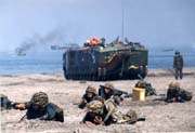假想解放军登陆 台军今早在澎湖实弹演习(图) 2001年12月27日 15:58 台军进行沙滩演习(资料图片) 中新网香港12月27日消息:台北讯,台湾军方的澎湖“国防司令部”,今天清晨实施反登陆实弹演习,操演过程中试射各种火炮。 澎湖“国防司令部”今早集结部队,在西屿外海展开“联信240号”演习。其间进行沙盘推演,图上作业标定目标,随即用军方的105、155榴弹炮进行对海射击。 之后,台军使用40防空炮对空射击,进行击机的操演。 台湾军方表示,操演是以实兵实弹射击,已验证台军的陆海空三军联合作战能力。 有参加演习的军官声称,此次军事操演的目的是假想解放军在台登陆,台军则以榴炮和机枪炮“绵密的射击”,“阻止”解放军登陆。 台军方声称,演习中,整个反舟波火炮射击都命中目标。 |