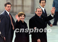 美国总统布什与夫人二十一日上午抵达北京首都国际机场,开始为期两天的工作访问。中新社图 毛建军 摄