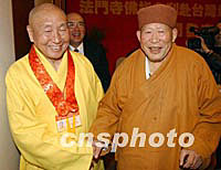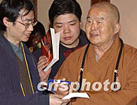 组图:法门寺佛指舍利赴台供奉新闻发布会 2002年02月22日 09:54 ![]() 法门寺佛指舍利赴台供奉新闻发布会,日前在西安喜来登大酒店举行,中国佛教协会等有关人士和台湾佛教人士以及来自大陆、港台的众多记者参加了发布会。图为台湾惟觉法师与法门寺净一方丈在发布会上。中新社记者 钱兴强 摄 ![]() 法门寺佛指舍利赴台供奉新闻发布会,日前在西安喜来登大酒店举行,中国佛教协会等有关人士和台湾佛教人士以及来自大陆、港台的众多记者参加了发布会。图为台湾星云法师为宾客签书。中新社记者 钱兴强 摄